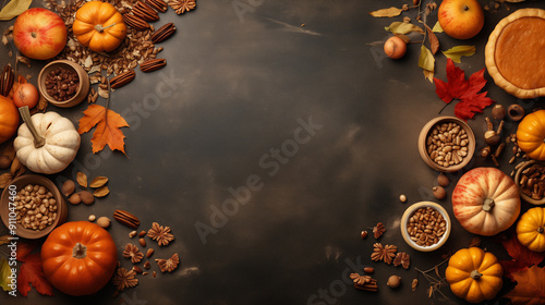 Autumn baking with pumpkins, apples, honey, nuts and seasonal spices on a stone table. Pumpkin or apple pie for Thanksgiving