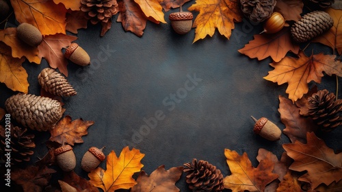 Autumn Berries and Leaves on Dark Red Background, Top View