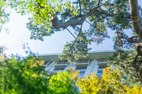 autumn blue sky and modern architecture that are seen over tree leaves of japanese garden, tokyo, japan