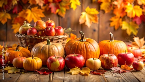 Autumn bounty of ripe apples and pumpkins on a rustic wooden table, surrounded by vibrant fall leaves