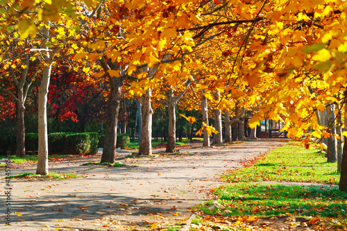 autumn city at bright sunny day, maple trees alley with yellow leaves