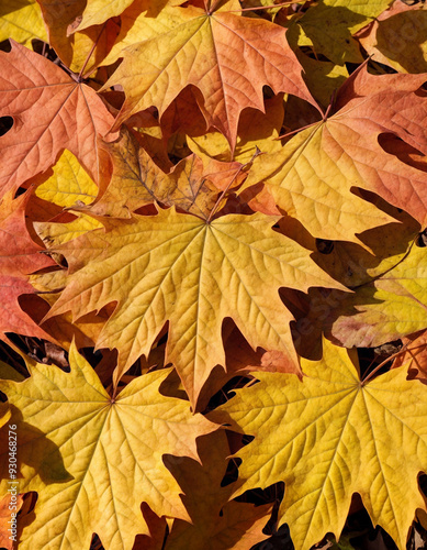 Autumn colored maple tree branch isolated at the edge of an empty sunny blue sky, blurry yellow and orange bright fall leaf background with copy space