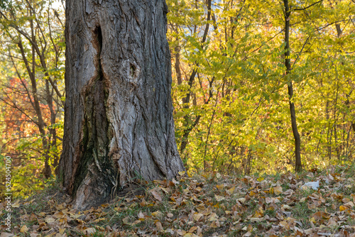 Autumn colors in sunny day in city park. Fallen leafs on the ground. Pathway among trunk trees with yellow leaves. Landscape golden foliage and plants. Autumn reflections. Fall bright. Beauty in natur