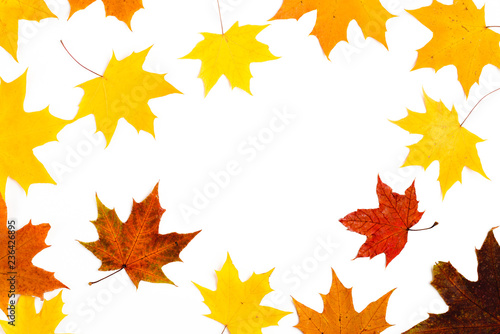 Autumn composition, maple leaves, top view, flat lay. Border made from color falling maple leaves