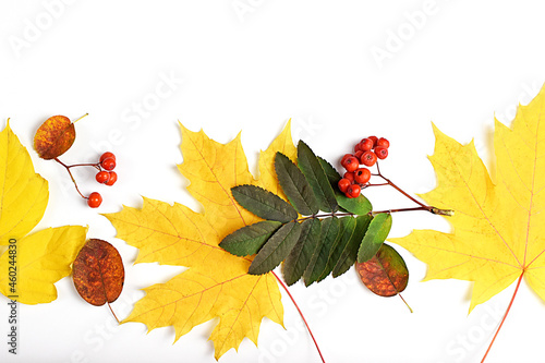 Autumn composition of bright leaves and rowan twigs. Frame from autumn leaves and rowan berries on a white background. Flat lay, top view, copy space for text.
