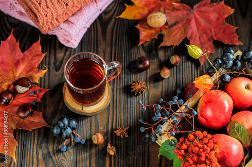 autumn composition with a mug of tea, autumn leaves, fruit and nuts, on the background of folded sweaters