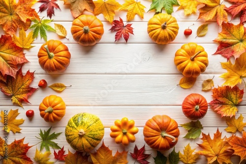 Autumn composition with pumpkins and leaves on white wooden background. Flat lay, top view, copy space