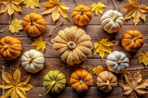Autumn composition with pumpkins and leaves on wooden background. Top view.