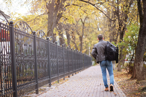 Autumn concept. A man walks through the city. Autumn leaves on the footpath.