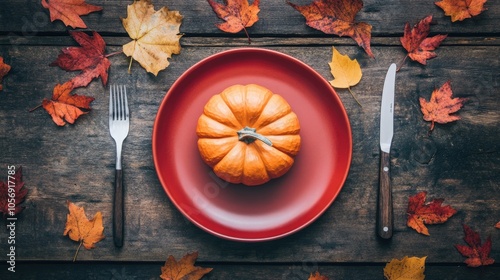 Autumn dinner table arrangement featuring a plate knife fork pumpkins and maple leaves Captured from a top view perspective