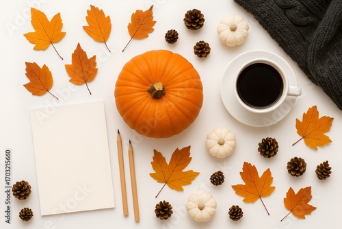 Autumn Flatlay with Pumpkin Coffee and Blank Note