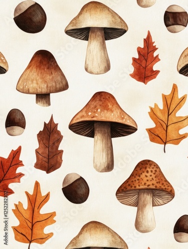 Autumn Foliage And Mushroom Pattern On A Cream Background With Warm Tones and Colors of Fall. Floral Pattern with Botanical Elements. A Woodland-Inspired Design. Seasonal Nature-Inspired Art. Harvest
