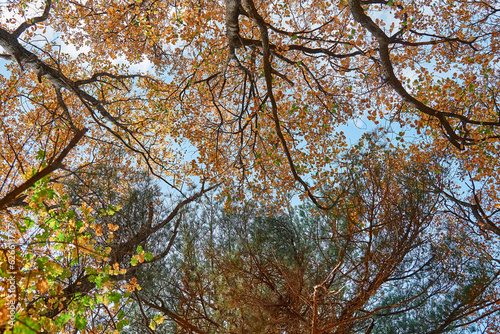 Autumn forest background. Vibrant color autumn trees twigs on blue sky background bottom view, red orange foliage in fall park.