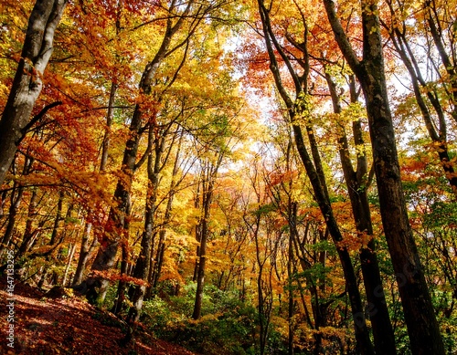 Autumn forest canopy. Sunlight filters through vibrant foliage