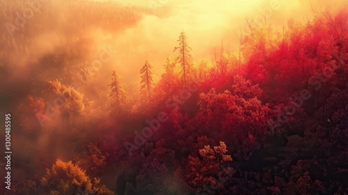 Autumn forest landscape with colorful foliage, misty mountains, sunrise light, peaceful nature scene, vibrant trees, serene outdoor environment.