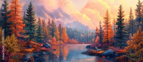 Autumn forest landscape with vibrant orange and red trees, serene lake reflecting mountains in background during golden hour light