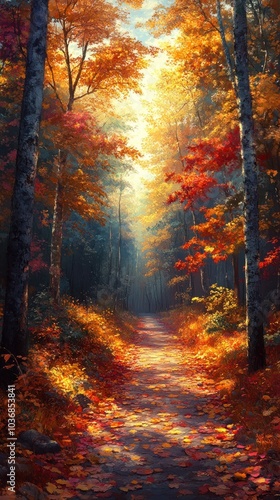Autumn Forest Path Illustration - Colorful Foliage and Golden Light
