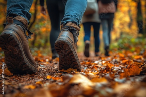 Autumn forest path offers perfect opportunity for small group of tourists to explore nature