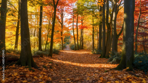 Autumn Forest with Fallen Leaves and Sunlight Filtering Through Trees