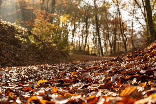 Autumn forest with sunbeams in Pilis near Devil's Mill Waterfall.