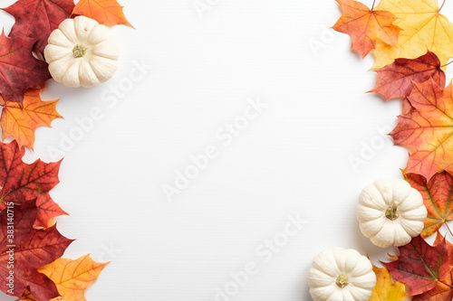 Autumn frame. Colorful maple leaves and pumpkins on white background. Flat lay, top view, copy space. Autumn fall, harvest, thanksgiving concept.