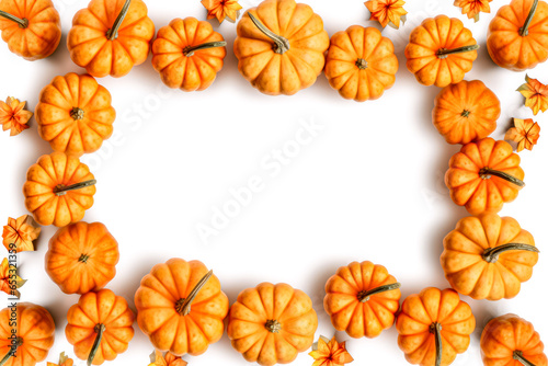Autumn frame with pumpkins and leaves on white background. Top view.