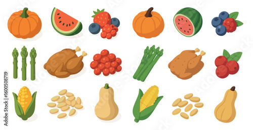 Autumn harvest isometric icons set – crops, vegetables, seasonal design graphics