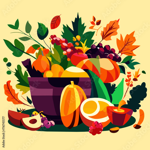 Autumn harvest vector illustration with pumpkin, apples, berries and leaves. Generative AI