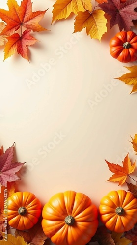 Autumn holiday background featuring pumpkins, colorful dried leaves, and fall decorations arranged at the bottom, leaving the top part empty. Flat lay, top view with copy space. Happy Thanksgiving, ha
