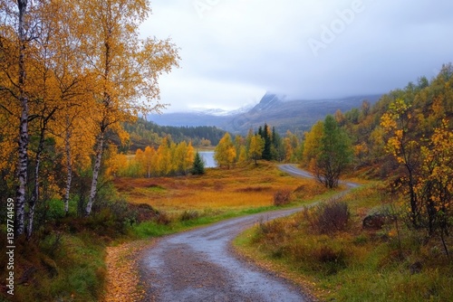 Autumn in Scandinavia with golden birch trees, muted background and crisp air