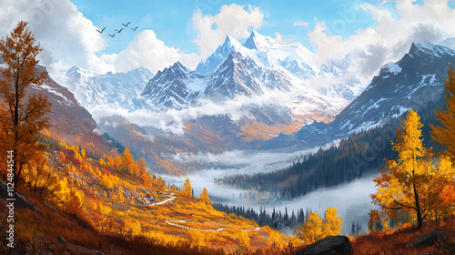 Autumn in the Alps with colorful foliage and golden leaves, misty valleys, and towering snow-capped peaks in the distance.