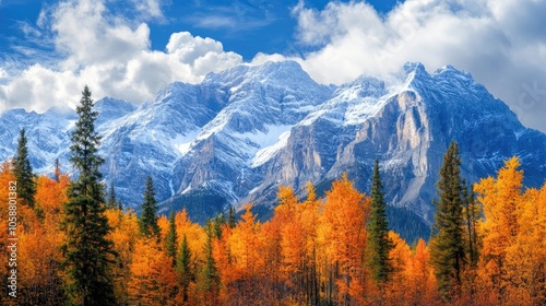Autumn landscape capturing a majestic rocky alpine mountain range adorned with snow, emphasizing the stunning beauty of the alpine scenery with ample copy space for text.