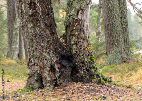 autumn landscape from the forest, dry leaves, dry grass and moss, tree trunk close-up
