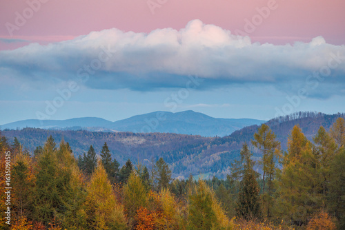 Autumn landscape with colorful trees and mountains under a pink and cloudy sky in the background.