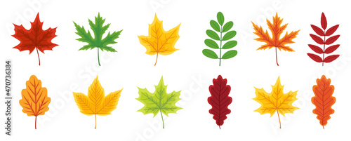 Autumn leaf. Set of autumn leaves of maple, oak, beech, birch and chestnut. Yellow, orange, red, green, brown color of leaves. Foliage from tree isolated on white background. Icon of forest. Vector