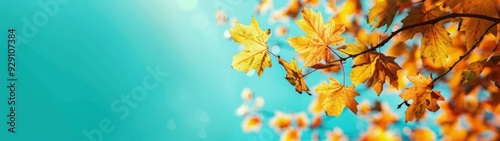 Autumn leaves against a turquoise sky background, a banner with a copy space area, an autumn concept, vibrant colors, blurred focus on the foreground Generative AI