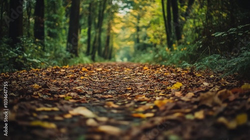 Autumn leaves covering a peaceful path in a forest with vibrant orange and yellow foliage during a tranquil afternoon