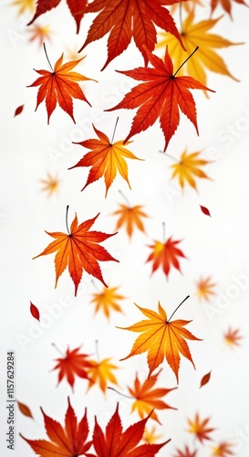 Autumn leaves fall in air. Vivid red, yellow maple leaves float against white background. Autumnal colors in motion. Seasonal backdrop. Natural foliage image. Nature design element. Colorful foliage.