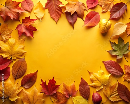Autumn leaves frame on a yellow background with copy space for text