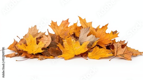 Autumn leaves gathered into a pile, isolated on a white background to highlight the seasonal colors