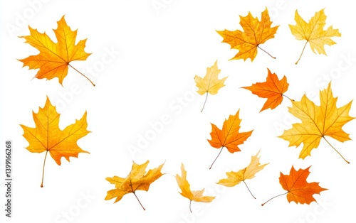 Autumn leaves in motion, scattered on a white background. Colorful, vibrant maple leaves in various shades of yellow, orange, and red. A seasonal, nature-inspired design