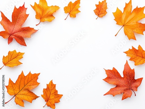 Autumn leaves in vibrant orange hues arranged in a circular pattern on white