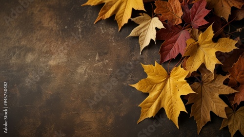 Autumn leaves on wooden surface. Gold, red and yellow seasonal fall maple leaves. Rustic wooden surface. Background, wallpaper, banner. Top view, room for copy space.