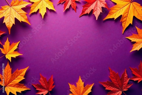 Autumn leaves scattered on violet background with intricate dry orange metallic leaf patterns, autumn leaves, nature