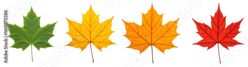Autumn maple leaf set PNG. Green, yellow, orange, and red maple leaves top view flat lay isolated. Colorful maple leaves PNG. Autumn leaf set with seasonal shades of green, yellow, orange and red