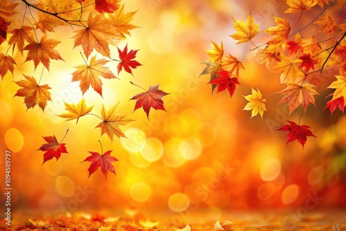Autumn Maple Leaves Falling on Bright Yellow Background for Seasonal Projects and Greeting Cards
