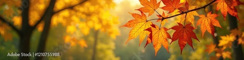 Autumn maple leaves in sunny light fall from tree branches, greenery, tree
