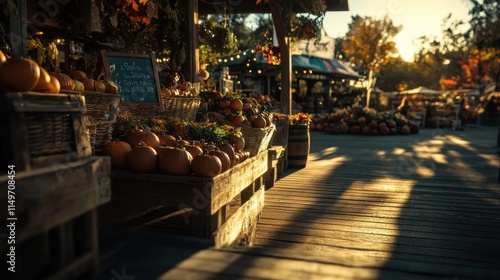 Autumn market stall with pumpkins displayed in wooden crates, sunlight casts shadows on the wooden walkway.