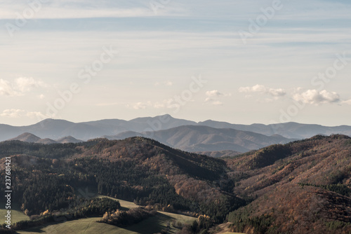 autumn mountain panorama with hillc, colorful forest, meadow and blue sky with few clouds