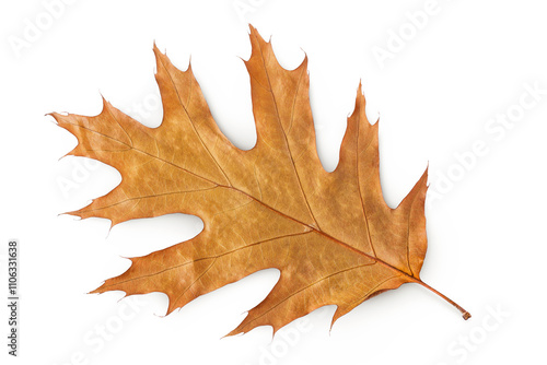 Autumn oak leaf isolated on white background. Fall season foliage. Top view. Flat lay